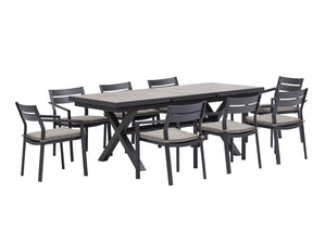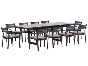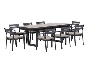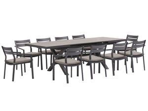 Robust and timelessly elegant, the Bondi-Mosman 11-Piece Ceramic Outdoor Extendable Dining Setting is a versatile outdoor entertaining solution all year round. The automatic pop-up extension mechanism on the table makes extending or folding the tabletop so easy. The table features three one-piece ceramic slabs, with a sturdy aluminium frame seamlessly wrapping around the edges, making it a more stable and refined product than similar ones on the market. Choose from two table leg designs to suit your taste and practical needs. The Bondi Aluminium Outdoor Dining Chair is airy yet solid. It features a fully-welded frame structure, clean aesthetic, and durable outdoor fabric that is soft to touch. The subtle irregular aluminium body adds a unique yet elegant touch to the design. Comfortable and stackable, they are perfect for everyday al fresco dining.