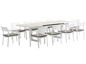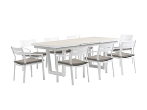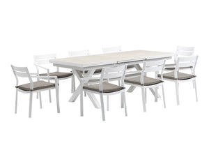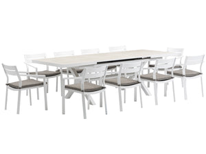 Robust and timelessly elegant, the Bondi-Mosman 11-Piece Ceramic Outdoor Extendable Dining Setting is a versatile outdoor entertaining solution all year round. The automatic pop-up extension mechanism on the table makes extending or folding the tabletop so easy. The table features three one-piece ceramic slabs, with a sturdy aluminium frame seamlessly wrapping around the edges, making it a more stable and refined product than similar ones on the market. Choose from two table leg designs to suit your taste and practical needs. The Bondi Aluminium Outdoor Dining Chair is airy yet solid. It features a fully-welded frame structure, clean aesthetic, and durable outdoor fabric that is soft to touch. The subtle irregular aluminium body adds a unique yet elegant touch to the design. Comfortable and stackable, they are perfect for everyday al fresco dining.