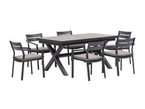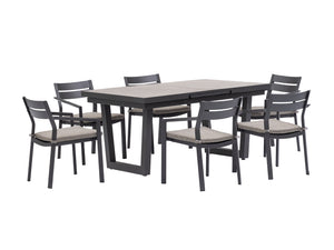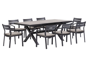 Robust and timelessly elegant, the Bondi-Mosman 9-Piece Ceramic Outdoor Extendable Dining Setting is a versatile outdoor entertaining solution all year round. The automatic pop-up extension mechanism on the table makes extending or folding the tabletop so easy. The table features three one-piece ceramic slabs, with a sturdy aluminium frame seamlessly wrapping around the edges, making it a more stable and refined product than similar ones on the market. Choose from two table leg designs to suit your taste and practical needs. The Bondi Aluminium Outdoor Dining Chair is airy yet solid. It features a fully-welded frame structure, clean aesthetic, and durable outdoor fabric that is soft to touch. The subtle irregular aluminium body adds a unique yet elegant touch to the design. Comfortable and stackable, they are perfect for everyday al fresco dining.