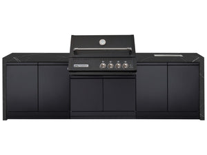 The main difference between the Classic, Premium, and Compact models is the width. They are 272 cm, 285 cm, and 215 cm wide respectively. The Classic model features grey stone benchtops for a timeless look. The Premium model, comes with stylish waterfall stone pieces on the sides, with white or black stone colour available. The Compact model, as the name suggests, is designed for smaller al fresco spaces, with each of the two side cabinets shortened by approximately 33% compared to the Classic model.