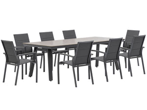 Robust and timelessly elegant, the Marina-Capri 9-Piece Sintered Stone Outdoor Dining Setting is a practical outdoor entertaining solution all year round. The Capri Sintered Stone Outdoor Dining Table’s design is deliberately understated. Its frameless single-piece sintered stone slab makes the tabletop virtually zero maintenance. The aluminium backing and legs provide rigid support for years of outdoor dining in any space. The Marina Aluminium Outdoor Dining Chairs are light, yet made of a very solid & rust-free aluminium construction. The double-layer padded texteline seat & back with quick-dry foam infill delivers lasting high tension, excellent comfort and exceptional performance. Comfortable and stackable, they are perfect for everyday al fresco dining.