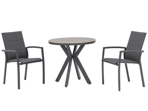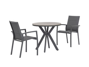 Robust and timelessly elegant, the Marina-Capri 3-Piece Sintered Stone Outdoor Dining Setting is a practical outdoor entertaining solution all year round. The Capri Sintered Stone Outdoor Dining Table’s design is deliberately understated. Its frameless single-piece sintered stone slab makes the tabletop virtually zero maintenance. The aluminium backing and legs provide rigid support for years of outdoor dining in any space. The Marina Aluminium Outdoor Dining Chairs are light, yet made of a very solid & rust-free aluminium construction. The double-layer padded texteline seat & back with quick-dry foam infill delivers lasting high tension, excellent comfort and exceptional performance. Comfortable and stackable, they are perfect for everyday al fresco dining.