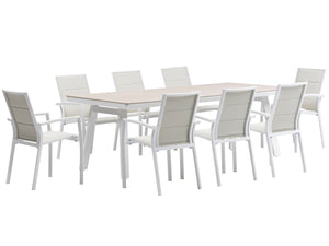 Robust and timelessly elegant, the Marina-Capri 9-Piece Sintered Stone Outdoor Dining Setting is a practical outdoor entertaining solution all year round. The Capri Sintered Stone Outdoor Dining Table’s design is deliberately understated. Its frameless single-piece sintered stone slab makes the tabletop virtually zero maintenance. The aluminium backing and legs provide rigid support for years of outdoor dining in any space. The Marina Aluminium Outdoor Dining Chairs are light, yet made of a very solid & rust-free aluminium construction. The double-layer padded texteline seat & back with quick-dry foam infill delivers lasting high tension, excellent comfort and exceptional performance. Comfortable and stackable, they are perfect for everyday al fresco dining.