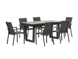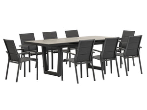 Robust and timelessly elegant, the new Marina-Mosman 9-Piece Ceramic Outdoor Extendable Dining Setting is a versatile outdoor entertaining solution all year round. The automatic pop-up extension mechanism on the table makes extending or folding the tabletop so easy. The table features three one-piece ceramic slabs, with a sturdy aluminium frame seamlessly wrapping around the edges, making it a more stable and refined product than similar ones on the market. Choose from two table leg designs to suit your taste and practical needs. The chairs are light, yet made of a very solid & rust-free aluminium construction. The double-layer padded texteline seat & back with quick-dry foam infill delivers lasting high tension, excellent comfort and exceptional performance. Comfortable and stackable, they are perfect for everyday al fresco dining.