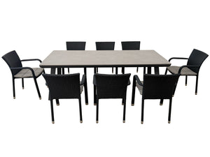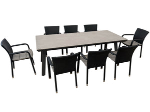 Robust and timelessly elegant, the Richmond-Capri 9-Piece Sintered Stone Outdoor Dining Setting is a practical outdoor entertaining solution all year round. The Capri Sintered Stone Outdoor Dining Table’s design is deliberately understated. Its frameless single-piece sintered stone slab makes the tabletop virtually zero maintenance. The aluminium backing and legs provide rigid support for years of outdoor dining in any space. The Richmond Wicker Outdoor Dining Chair features tightly woven half round double-stranded all-weather wicker, rust-proof aluminium frame, a supportive seat cushion, and a stackable design.