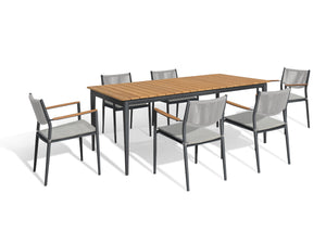 Simple yet elegant. The Axis dining table features a minimal and pure profile to complement the slim legs. The tabletop is made of teak with rounded corners. Its compact 160x90cm footprint makes it the ideal table for six chairs in a small patio.
