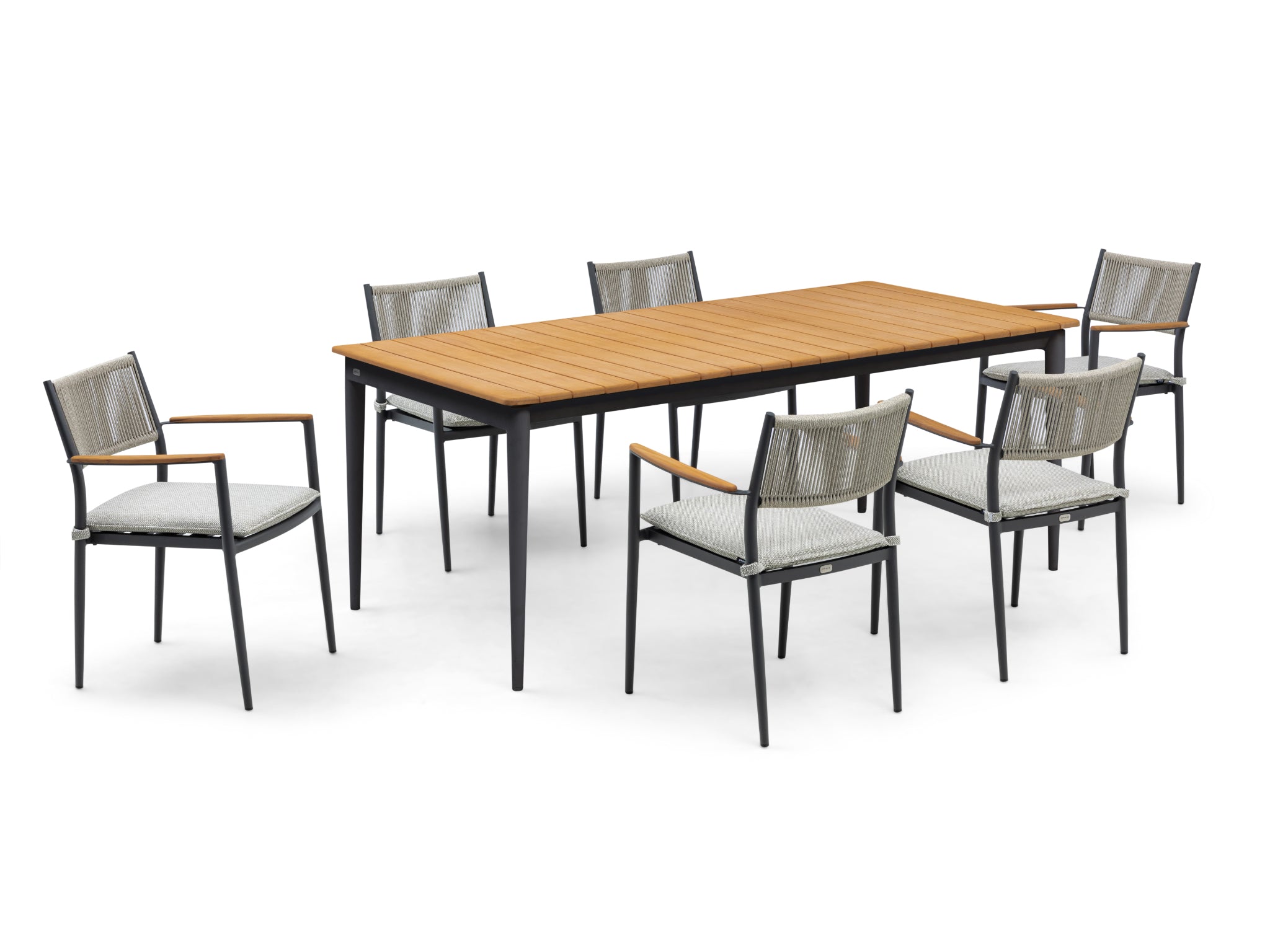 The contemporary design of the Timmi dining chair and its harmonious combination of aluminium and woven back will create a cozy atmosphere on your patio. The olefin rope stretches vertical over a solid aluminium frame. The polished teak bars mould to the frame beneath. The aluminium seat with olefin seat cushion delivers the comfort with no compromise on beauty.